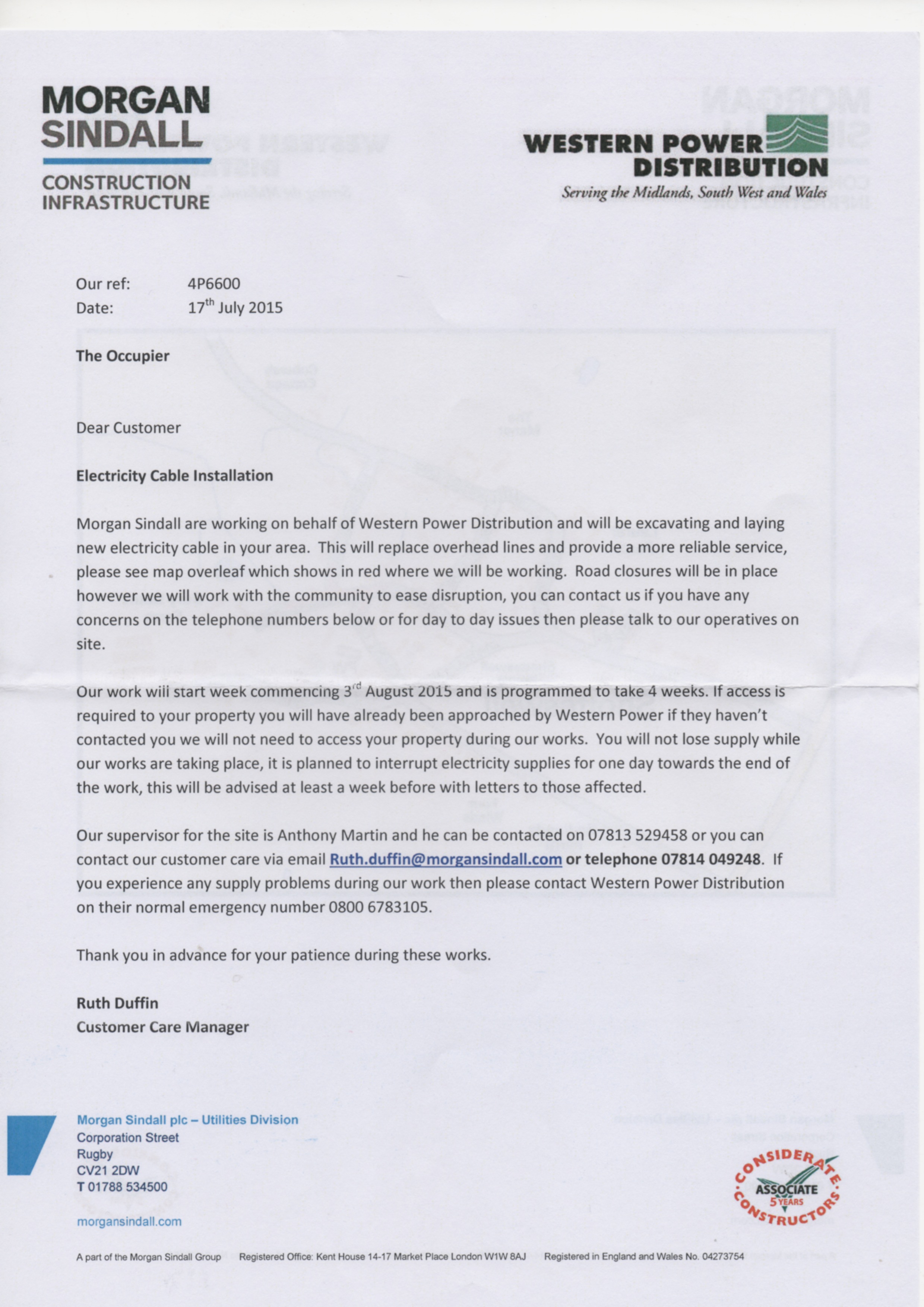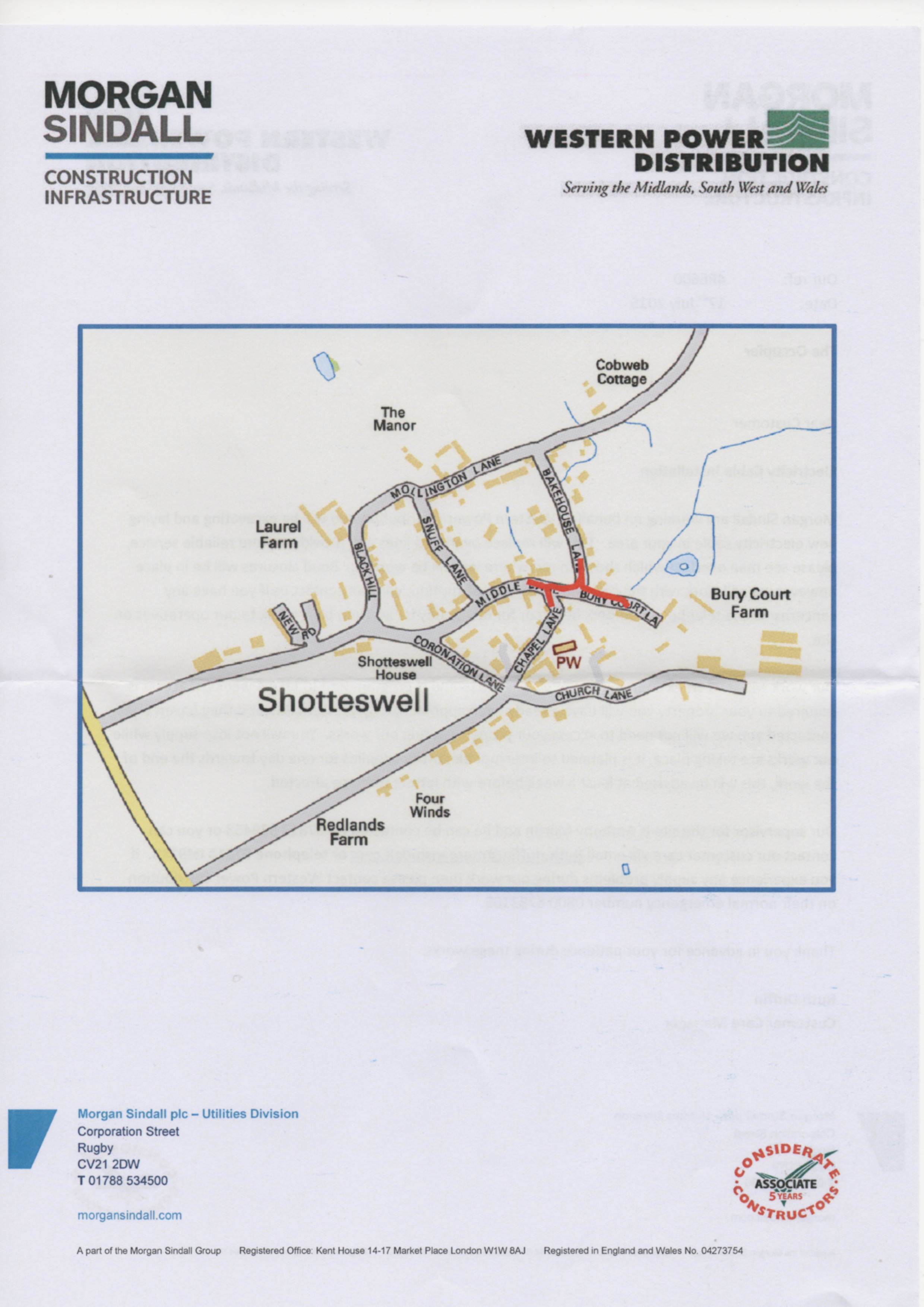 The Parish Council was concerned to hear the proposal to close all of the aforementioned lanes completely for a month. However, following a meeting with Western Power and with the assistance of WCC we have negotiated instead a staggered/phased process of road closures, to minimise disruption to our residents. Although there will be a couple of days where unavoidably all of the lanes will be closed, this will not be until towards the end of the project.