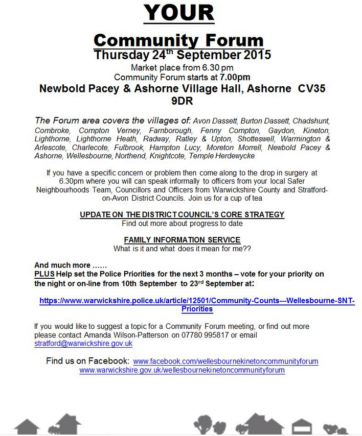 Wellesbourne and Kineton Community Forum – The Wellesbourne and Kineton Community Forum will not be taking place in December 2015. However, a district wide Partnership Conference – ‘Spotlight on our Communities’ will be taking place on Wednesday 2nd December, 6.00 pm at University of Warwick, Wellesbourne Campus (A429 – Cirencester Road). All are welcome to attend where there will be an opportunity to meet with Leaders from Stratford District, Warwickshire County Council, Warwickshire Police, South Warwickshire Clinical Commissioning Group and the Police & Crime Commissioners Office to raise any issues. There will also be an opportunity for delegates to help develop future priorities for communities and raise community issues. If you are going, please let Amanda Wilson-Patterson know in advance. Amanda can be contacted on amandawilsonpatterson@warwickshire.gov.uk